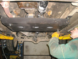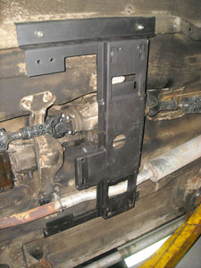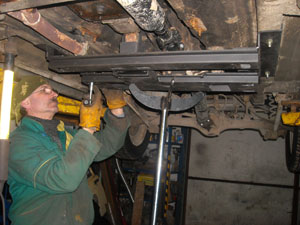 Закрепив траверсы и кронштейны можно приступать к установке. Лыжу необходимо снять, а оставшуюся конструкцию установить на лонжероны автомобиля таким образом, чтобы передние по ходу движения отверстия кронштейнов совпали с вентиляционными отверстиями лонжеронов. Далее подрамник фиксируется либо домкратом (если на яме), либо стойкой (если на подъёмнике) и используя крепёжные отверстия кронштейнов как кондуктор сверлятся отверстия 12мм насквозь лонжерона в пол салона.