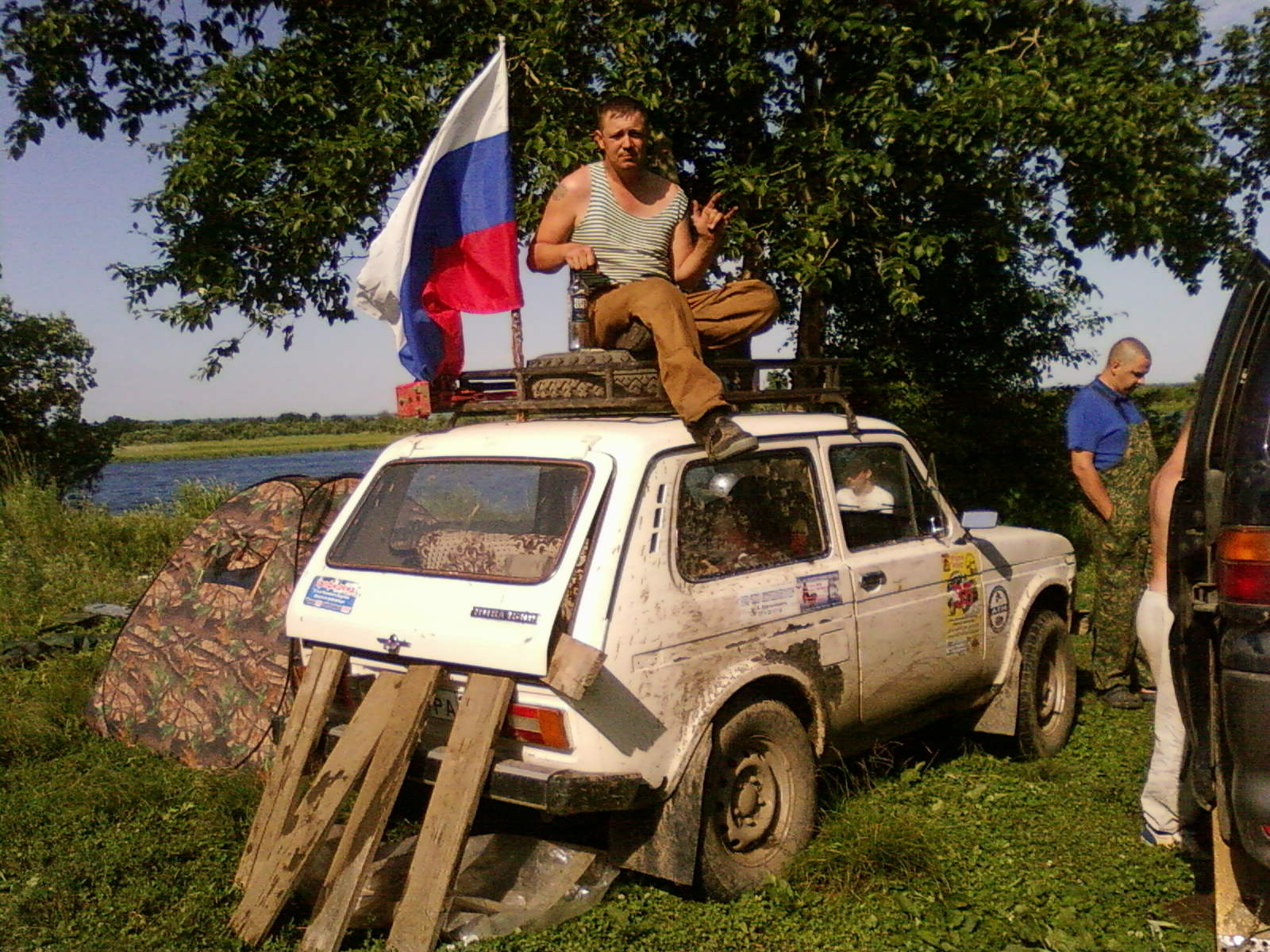 С кузова ничего снимать не нужно. Кувырок прошел довольно безболезненно для кузова (большая фотка после кувырка) только благодаря мощному и довольно тяжелому экспидиционнику. Стойки кузова и стекла (все !) целые, двери работают. Теперь вопрос: как и к чему прткрепить задние буксировочные поушины и бампер (чтобы дергать и джечиться) ???
